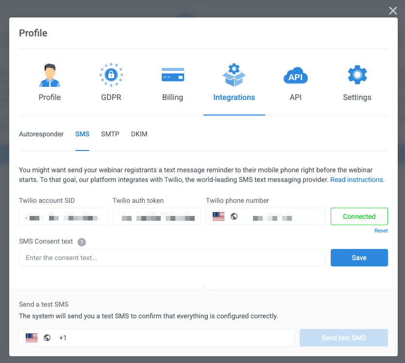 Connect Twilio with your account to enable SMS and voice messaging reminders for your webinars.